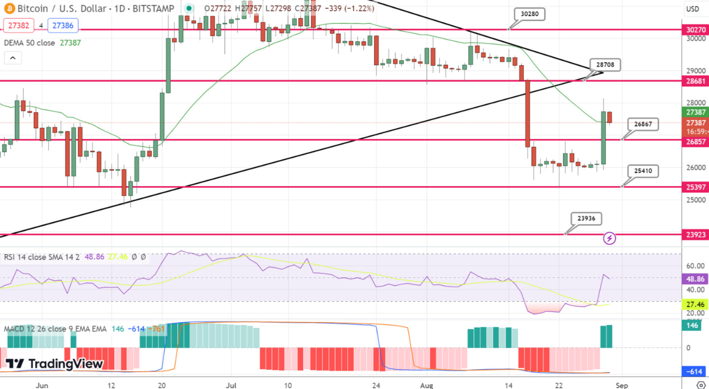 Following the bullish breakout above $26,800, Bitcoin’s trajectory may potentially lead it toward the $28,600 mark.