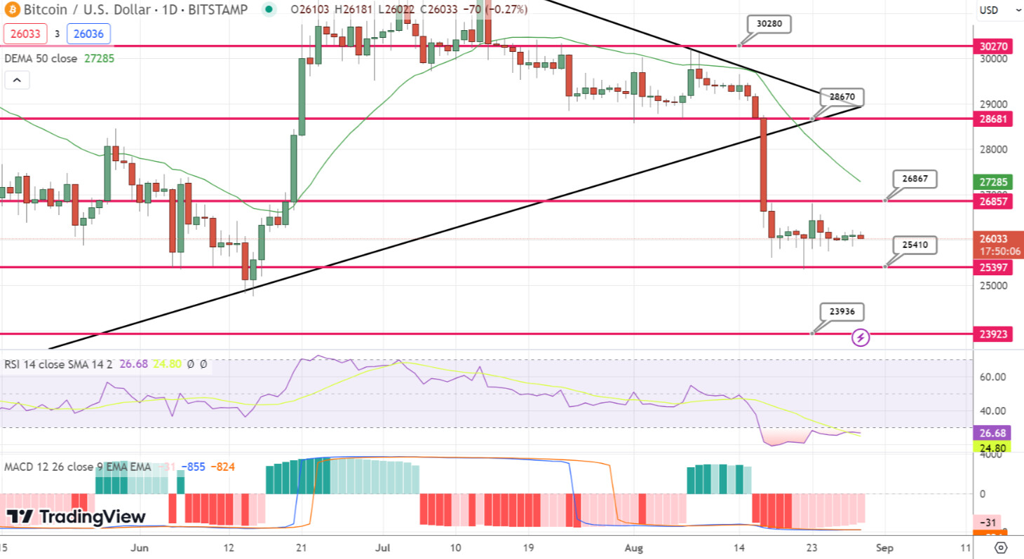Conversely, a bullish breakout above 26,800 could pave the way for Bitcoin to approach the 28,600 level.