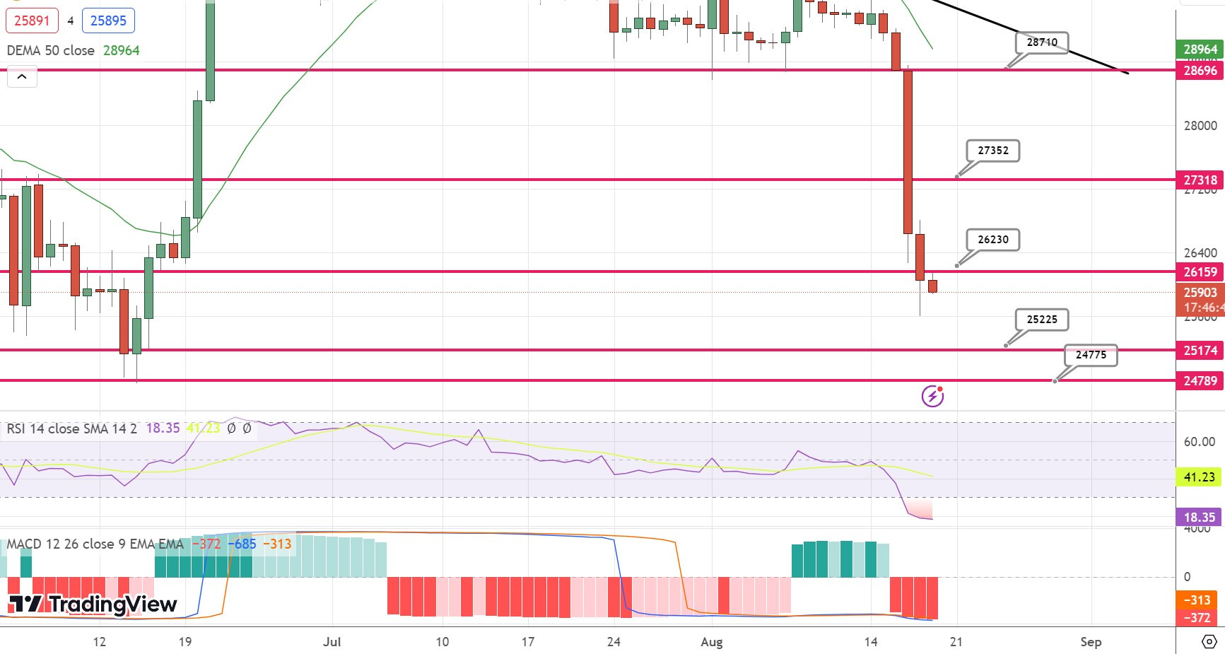 If this trajectory continues, Bitcoin could potentially fall to $25,600, with a further drop to the $25,200 threshold.